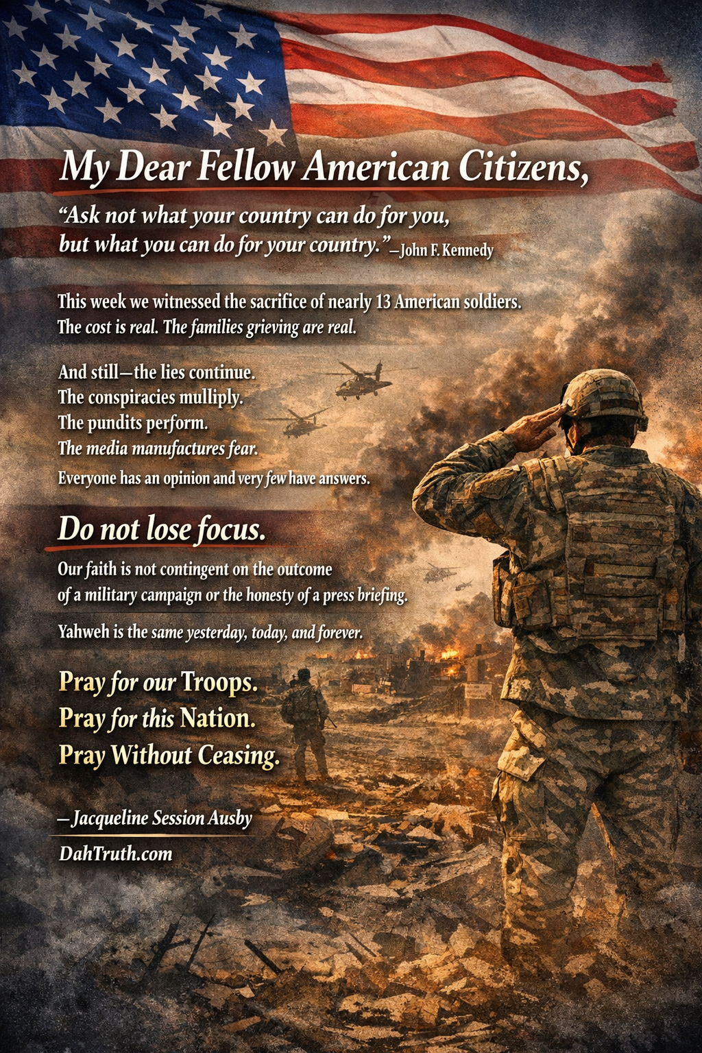So this is where I land at the end of a week full of lies. Not in despair. Not in fear. In a posture of prayer and watchfulness. We should protect our values. We should protect our way of life. We should protect the right to worship the God of the Bible, Yahweh, freely and without apology on the soil our ancestors built and bled for. If we believe, then we trust His will — whatever it costs, wherever it leads. That is not weakness. That is the only kind of courage that outlasts the news cycle.